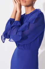 O decote careca com franzido valoriza a região do colo com sutileza, enquanto as mangas bufantes ganham destaque com babados verticais centralizados, criando um efeito romântico e cheio de personalidade. Os punhos finos com botões personalizados acrescentam um toque refinado e exclusivo ao design.