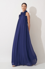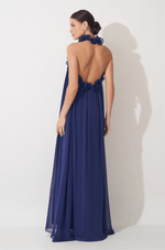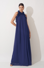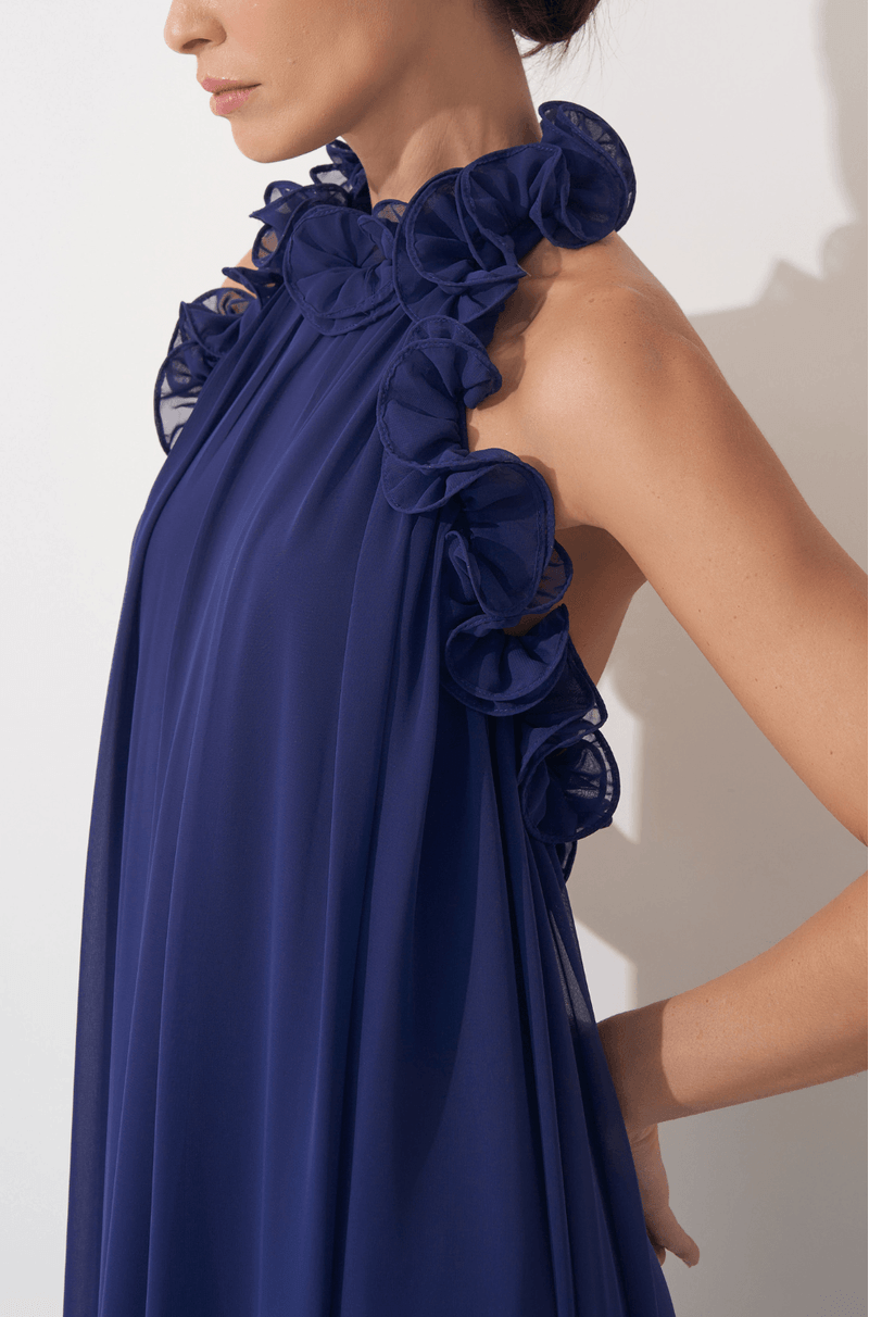 Longo em chiffon de caimento leve e movimento fluido, este vestido apresenta uma modelagem soltinha do busto à saia, garantindo conforto e um efeito etéreo. O decote alto frente única, finalizado com uma gola de babados, adiciona um romantismo moderno e se estende até as costas em um decote V aberto e marcante. Na região do busto, o franzido suave cria volume na medida certa, enquanto a saia ampla entrega um visual clássico e envolvente ¿ ideal para madrinhas e convidadas de eventos formais. Acompanha faixa para valorizar a silhueta com delicadeza.