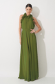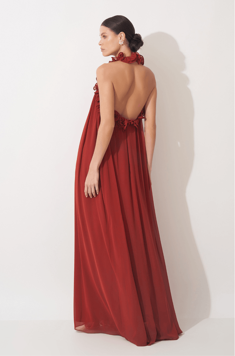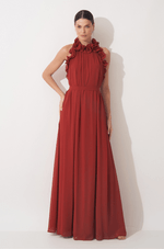 Longo em chiffon de caimento leve e movimento fluido, este vestido apresenta uma modelagem soltinha do busto à saia, garantindo conforto e um efeito etéreo. O decote alto frente única, finalizado com uma gola de babados, adiciona um romantismo moderno e se estende até as costas em um decote V aberto e marcante. Na região do busto, o franzido suave cria volume na medida certa, enquanto a saia ampla entrega um visual clássico e envolvente ¿ ideal para madrinhas e convidadas de eventos formais. Acompanha faixa para valorizar a silhueta com delicadeza.