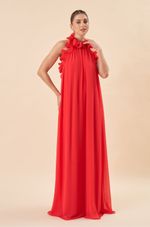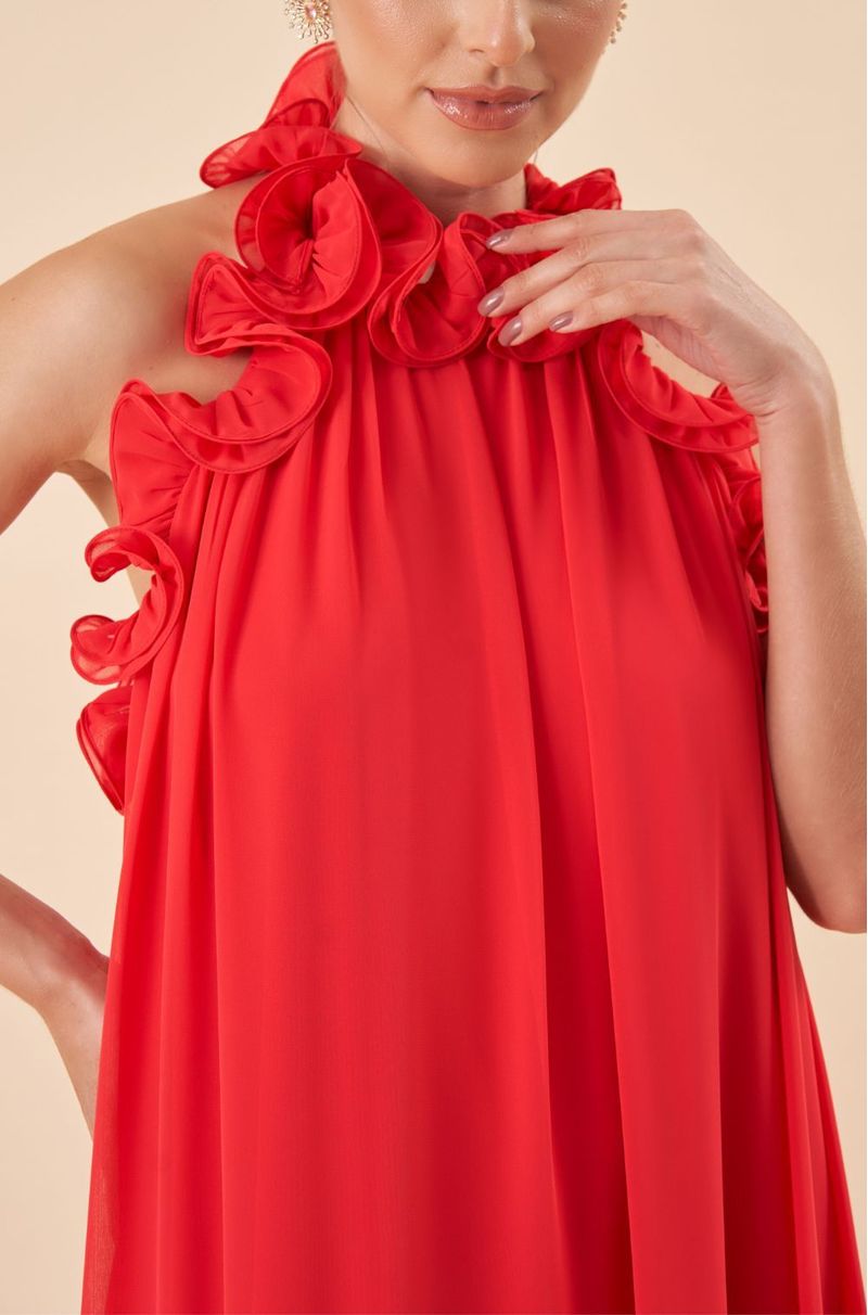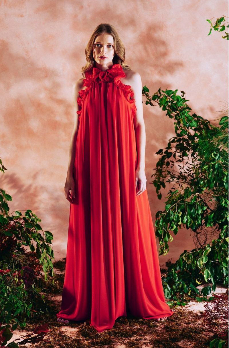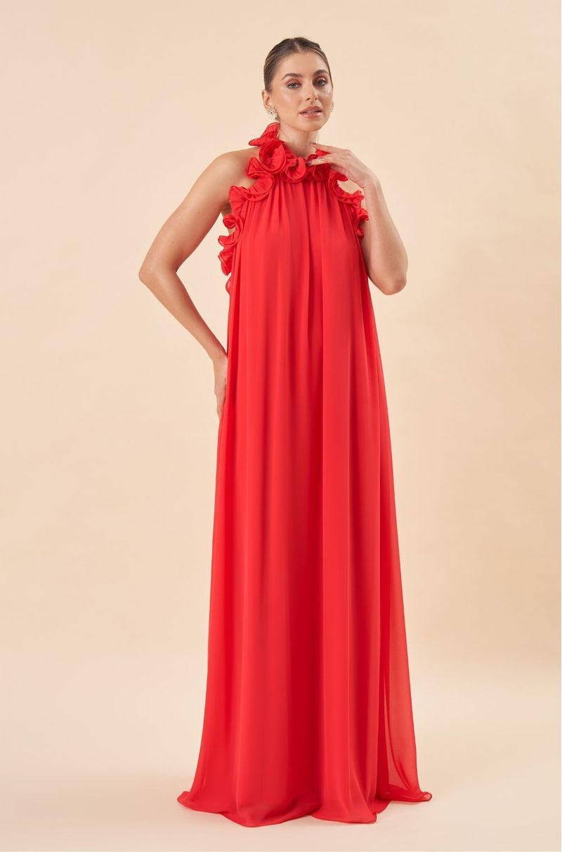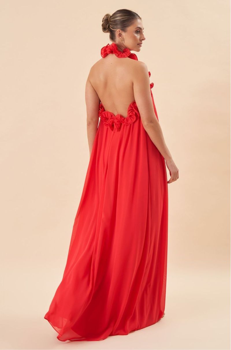 Longo em chiffon de caimento leve e movimento fluido, este vestido apresenta uma modelagem soltinha do busto à saia, garantindo conforto e um efeito etéreo. O decote alto frente única, finalizado com uma gola de babados, adiciona um romantismo moderno e se estende até as costas em um decote V aberto e marcante. Na região do busto, o franzido suave cria volume na medida certa, enquanto a saia ampla entrega um visual clássico e envolvente ¿ ideal para madrinhas e convidadas de eventos formais. Acompanha faixa para valorizar a silhueta com delicadeza.