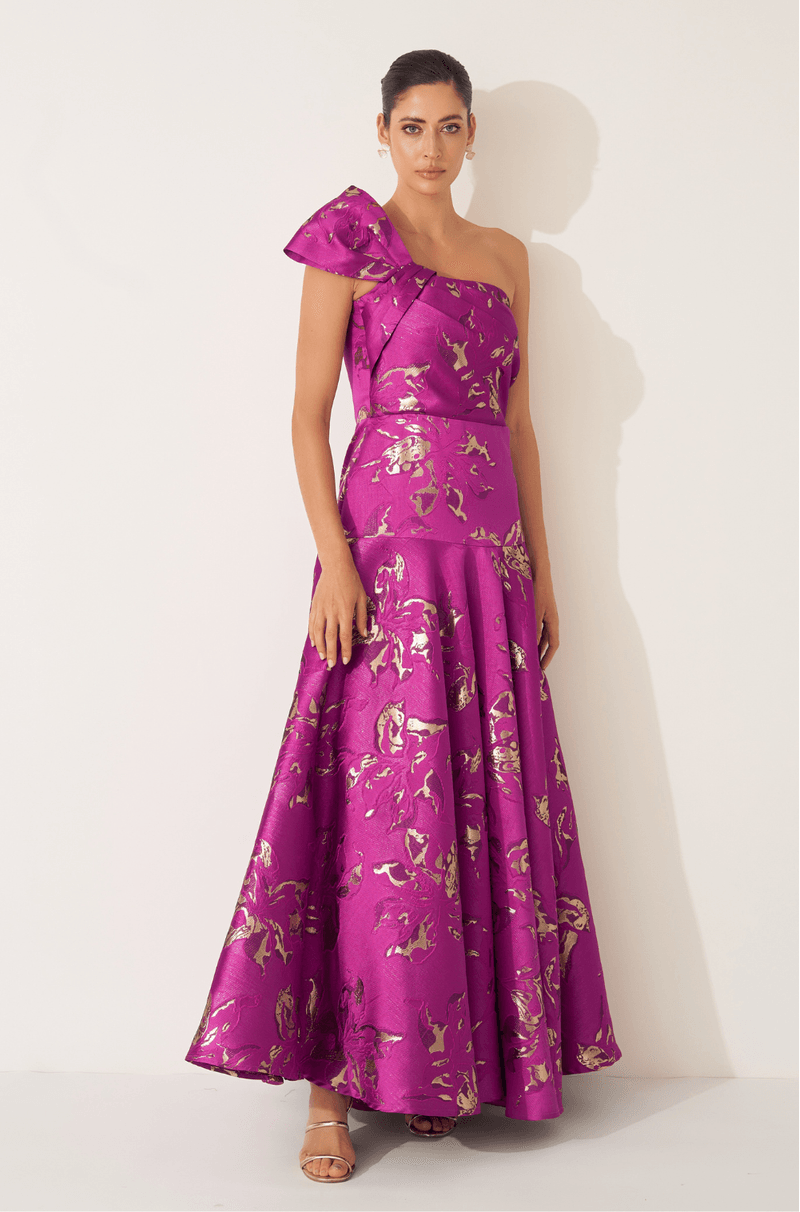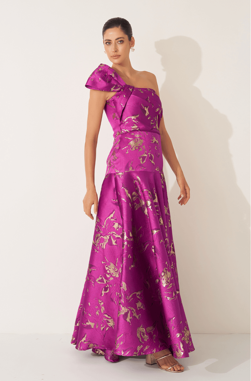 Com presença marcante e riqueza de detalhes, este vestido longo em jacquard floral com fios de lurex traduz o equilíbrio perfeito entre sofisticação clássica e modernidade. A escolha ideal para madrinhas de casamento e convidadas de eventos de gala, a peça se destaca pela imponência do tecido e pela fluidez elegante da modelagem. O jacquard encorpado com textura floral oferece um visual tridimensional, enriquecido por delicados fios de lurex que captam a luz com sutileza e refinamento. O destaque da peça está no decote ombro único, que une charme contemporâneo à tradição dos laços femininos. O laço fixo com detalhe de passante na alça cria uma assimetria moderna e delicada, ideal para quem busca um look com personalidade. As pregas sutis no busto favorecem o caimento da parte superior, trazendo estrutura sem perder a leveza. Já a saia rodada em modelagem ampla adiciona movimento e volume, criando um efeito de impacto visual que acompanha o caminhar com elegância. Detalhes da peça: - Comprimento longo - Confeccionado em jacquard texturizado - Detalhes em fios de lurex - Decote assimétrico ombro único com laço fixo - Passante na alça e pregas no busto - Saia rodada com volume - Zíper invisível central nas costas #DicaAmiga: O detalhe de um ombro só pede cabelos presos ou semi-presos para valorizar o decote. Finalize com brincos longos e sandália de salto fino para realçar a sofisticação do jacquard.