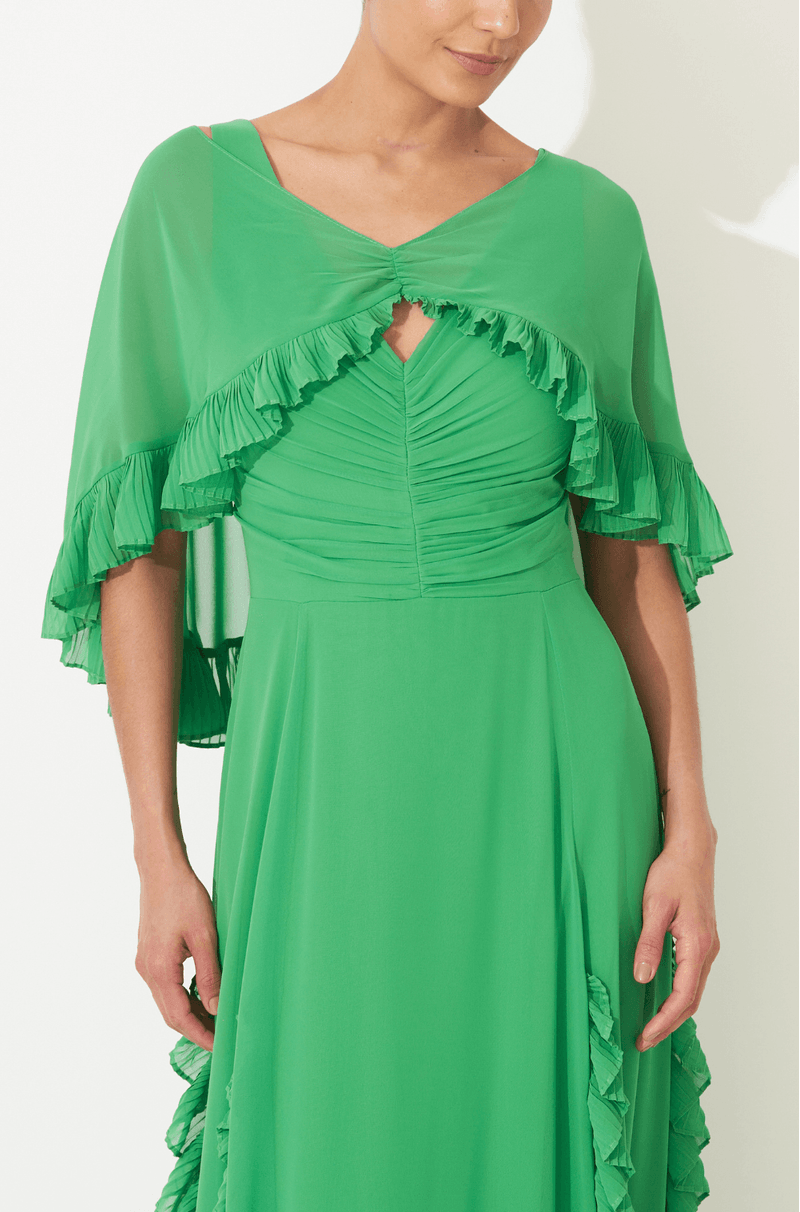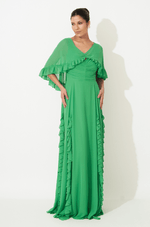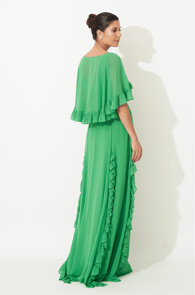 Vestido longo em chiffon, com caimento leve e sofisticado. O decote em V com alças largas e franzido central valoriza o busto com elegância. A saia rodada ganha destaque com recortes verticais e babados plissados, que proporcionam movimento e fluidez. Acompanha capa removível curta, com franzido no centro e babados plissados, trazendo um toque extra de charme e romantismo. Fechamento em zíper invisível no centro das costas, garantindo acabamento delicado e impecável. Ideal para madrinhas e convidadas que buscam uma produção única e cheia de personalidade.