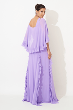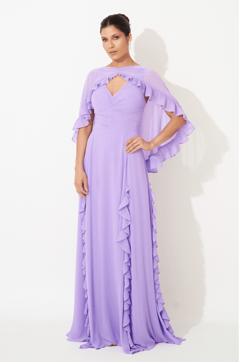 Vestido longo em chiffon, com caimento leve e sofisticado. O decote em V com alças largas e franzido central valoriza o busto com elegância. A saia rodada ganha destaque com recortes verticais e babados plissados, que proporcionam movimento e fluidez. Acompanha capa removível curta, com franzido no centro e babados plissados, trazendo um toque extra de charme e romantismo. Fechamento em zíper invisível no centro das costas, garantindo acabamento delicado e impecável. Ideal para madrinhas e convidadas que buscam uma produção única e cheia de personalidade. Detalhes da peça: - Tecido chiffon - Decote V com alças largas e franzido central no busto - Saia rodada com recortes verticais e babados plissados - Capa removível curta com franzido e babados plissados - Fechamento em zíper invisível no centro das costas #DicaAmiga: Use com brincos statement e cabelos presos para valorizar o decote e o detalhe da capa. Aposte em sandálias delicadas para um visual leve e elegante.
