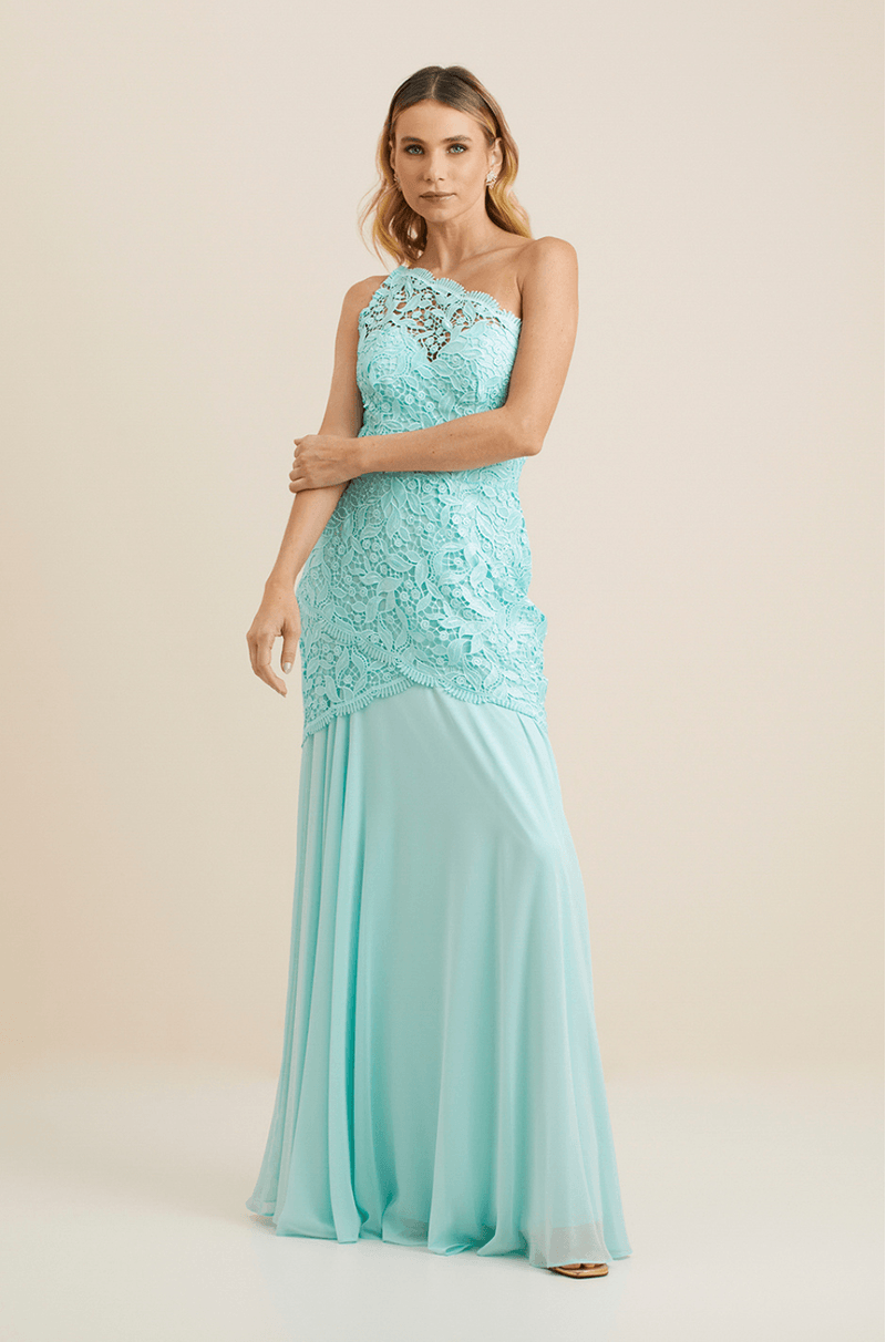 Vestido longo em guipure com sobreposição de chiffon, que une sofisticação e movimento. O decote ombro único com alça dupla fina revela o colo com delicadeza e traz um toque moderno. O quadril é valorizado pelo detalhe transpassado, que cria recorte elegante. A saia apresenta duas camadas: uma base curta em guipure e uma sobreposição longa e ampla em chiffon 180°, garantindo leveza e fluidez em cada passo. Ideal para casamentos, formaturas e eventos de gala.