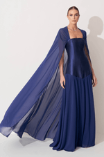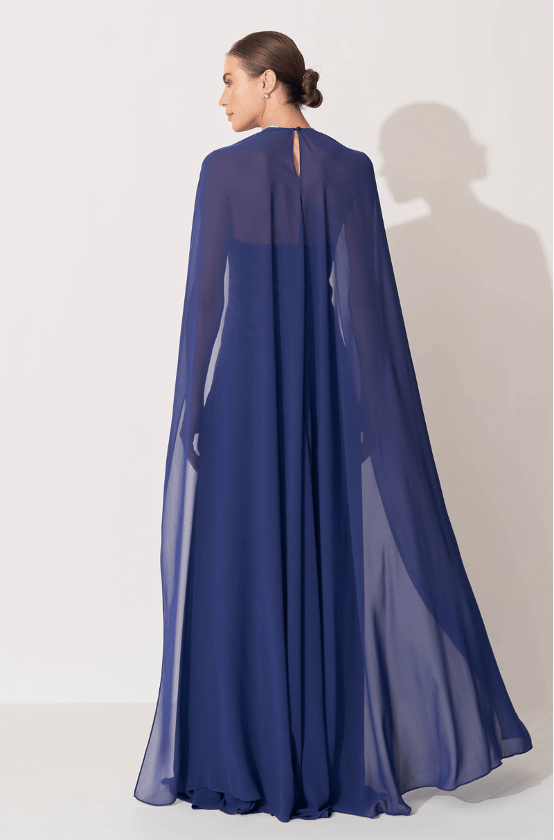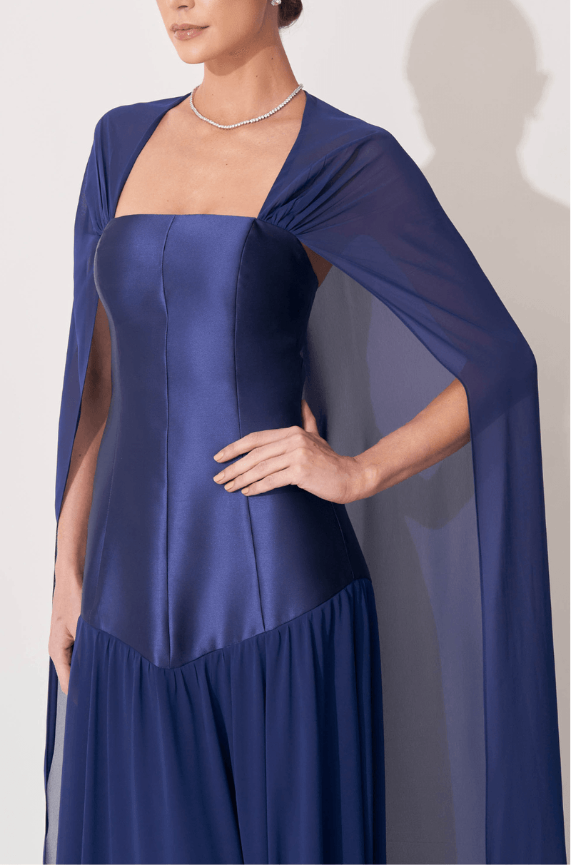 A manga capa em chiffon traz leveza e um toque suave, cobrindo os ombros com charme e sutileza. A saia solta, levemente franzida, oferece movimento suave e sofisticado, ideal para quem deseja conforto sem abrir mão do estilo.