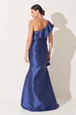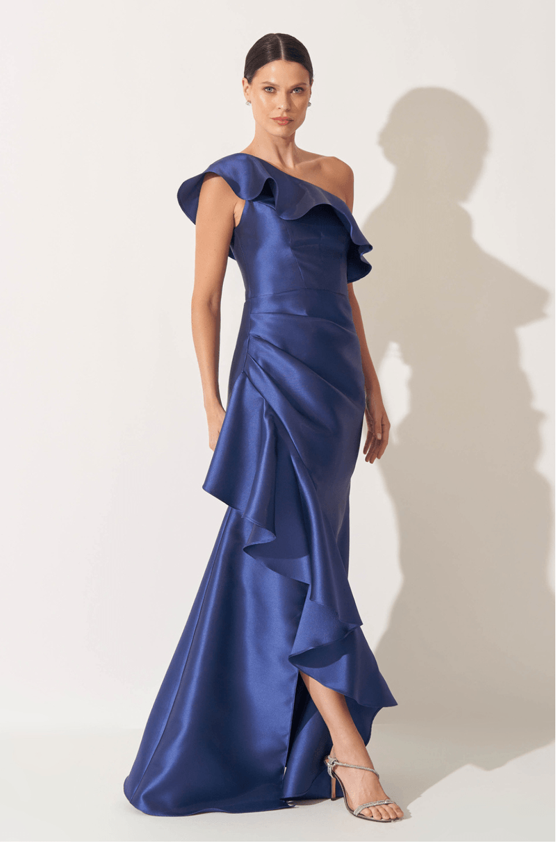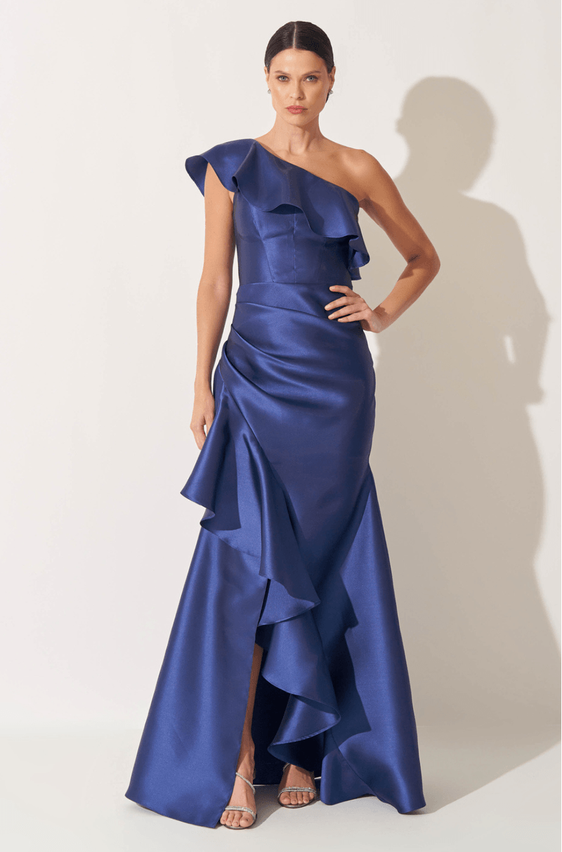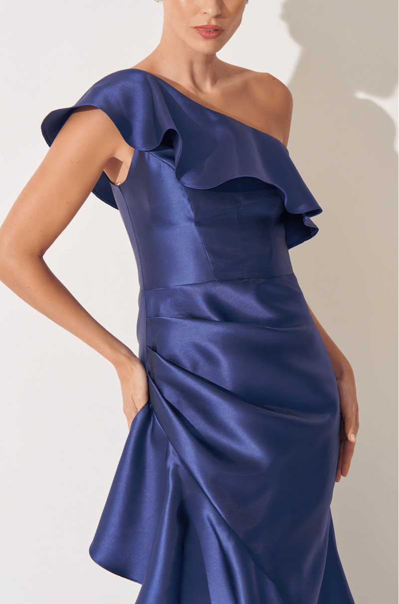 Descubra a sofisticação deste vestido longo em zibeline estruturado, pensado para mulheres que desejam um visual marcante em eventos formais. O decote ombro único, adornado com um babado amplo, cria um impacto imediato, combinando modernidade e elegância.
