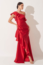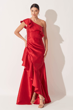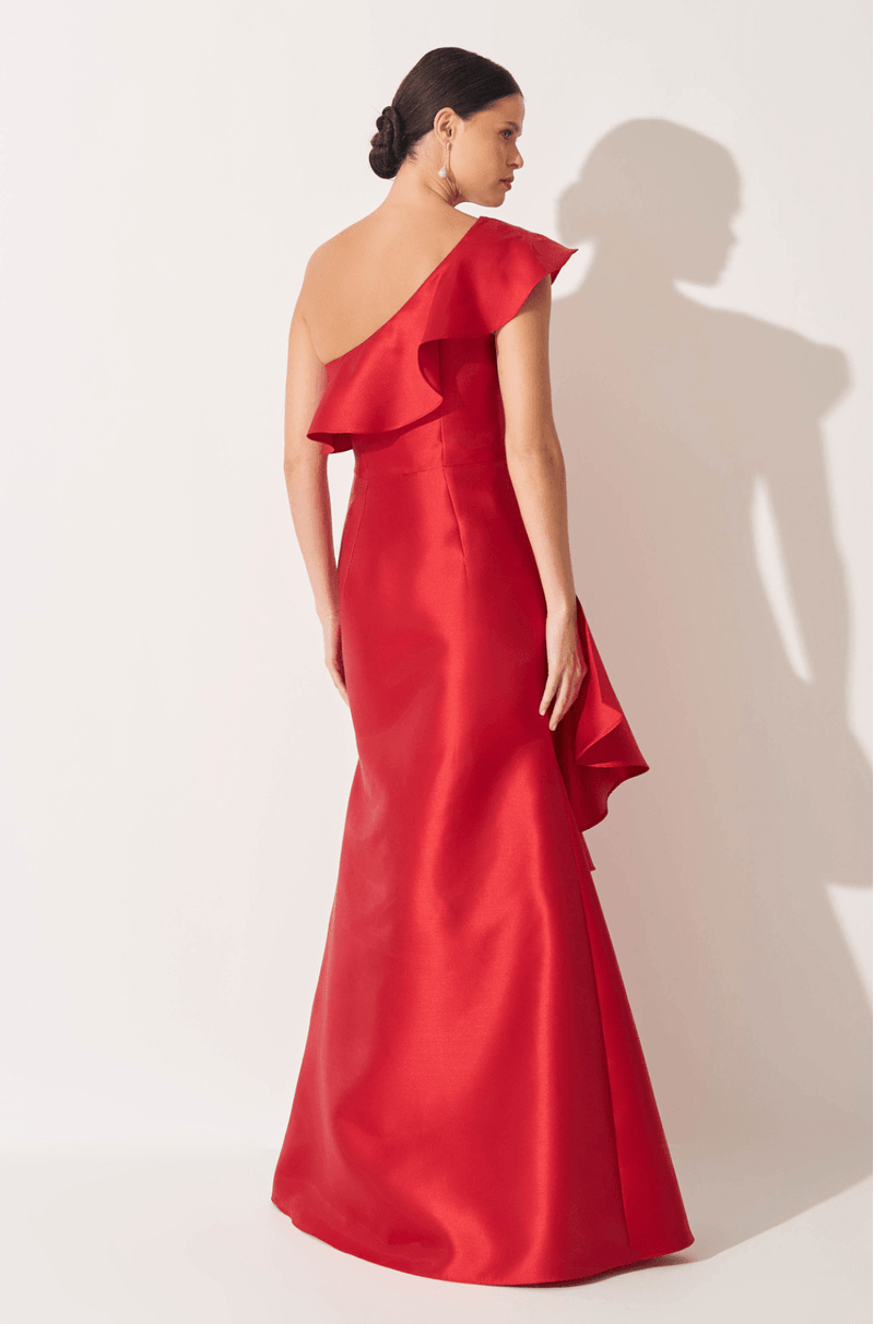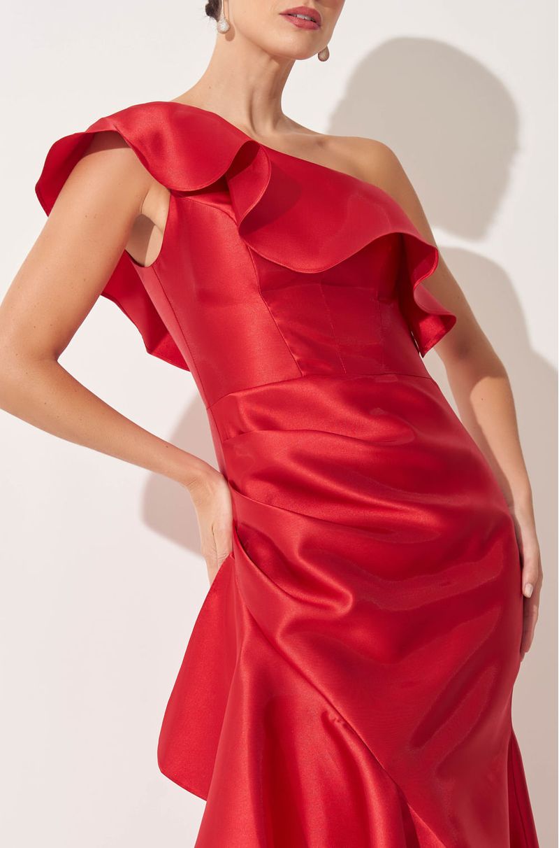 Descubra a sofisticação deste vestido longo em zibeline estruturado, pensado para mulheres que desejam um visual marcante em eventos formais. O decote ombro único, adornado com um babado amplo, cria um impacto imediato, combinando modernidade e elegância.