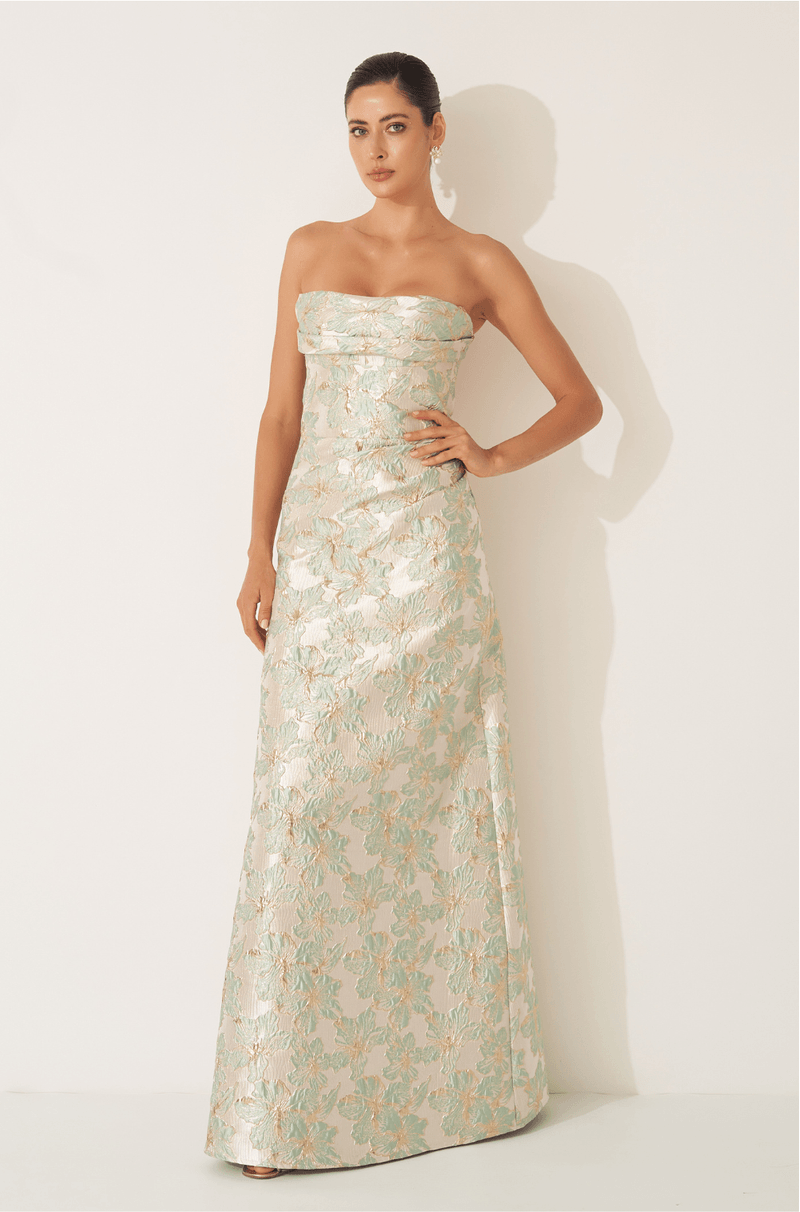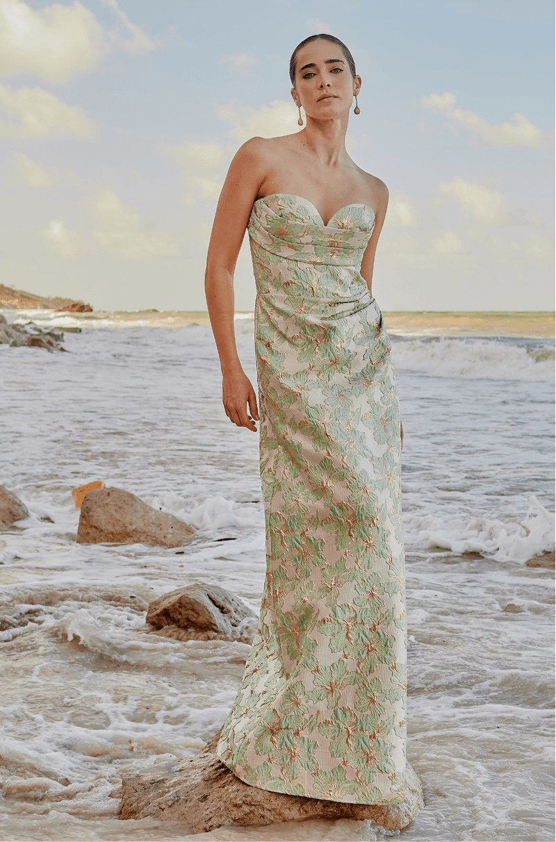 Confeccionado em jacquard estruturado, este vestido longo é a escolha perfeita para quem deseja um visual sofisticado, com caimento impecável e acabamento de alto padrão. O tecido encorpado valoriza a silhueta e adiciona um toque de luxo sutil à produção, ideal para ocasiões especiais.