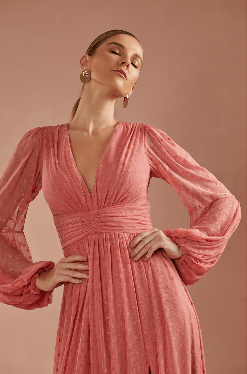 - Vestido longo Vanessa confeccionado em tule de poá;