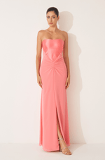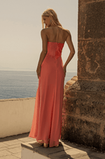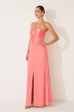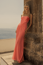 Vestido longo em zibeline e chiffon, que une estrutura e leveza em um só visual. O busto estruturado com recortes em zibeline valoriza o colo com decote sem alças elegante e moderno. O franzido no quadril em chiffon traz suavidade, equilibrando a imponência da saia sereia com fenda frontal. As costas apresentam fechamento com zíper invisível, garantindo acabamento impecável. Perfeito para madrinhas sofisticadas ou convidadas em eventos de gala.