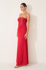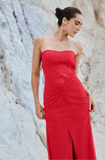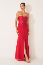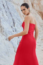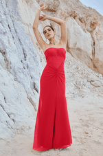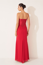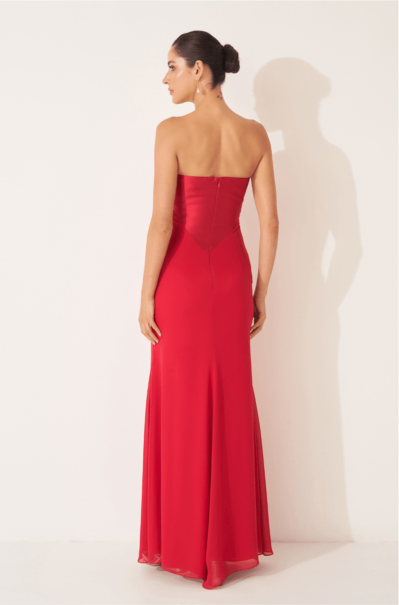 O busto estruturado em zibeline apresenta recortes que valorizam o colo com um decote sem alças limpo, moderno e atemporal. A imponência do zibeline contrasta de forma harmônica com o chiffon franzido no quadril, que suaviza a transição para a saia sereia com fenda frontal, criando um movimento leve e sutilmente sensual ao caminhar.