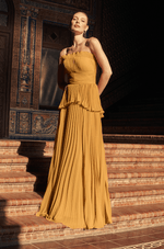 A saia longa apresenta plissado contínuo, garantindo movimento fluido e graça a cada passo. O zíper invisível nas costas oferece acabamento impecável e conforto.