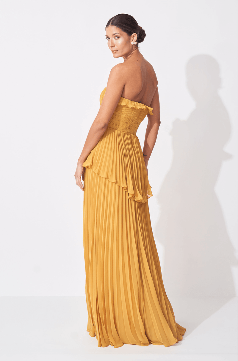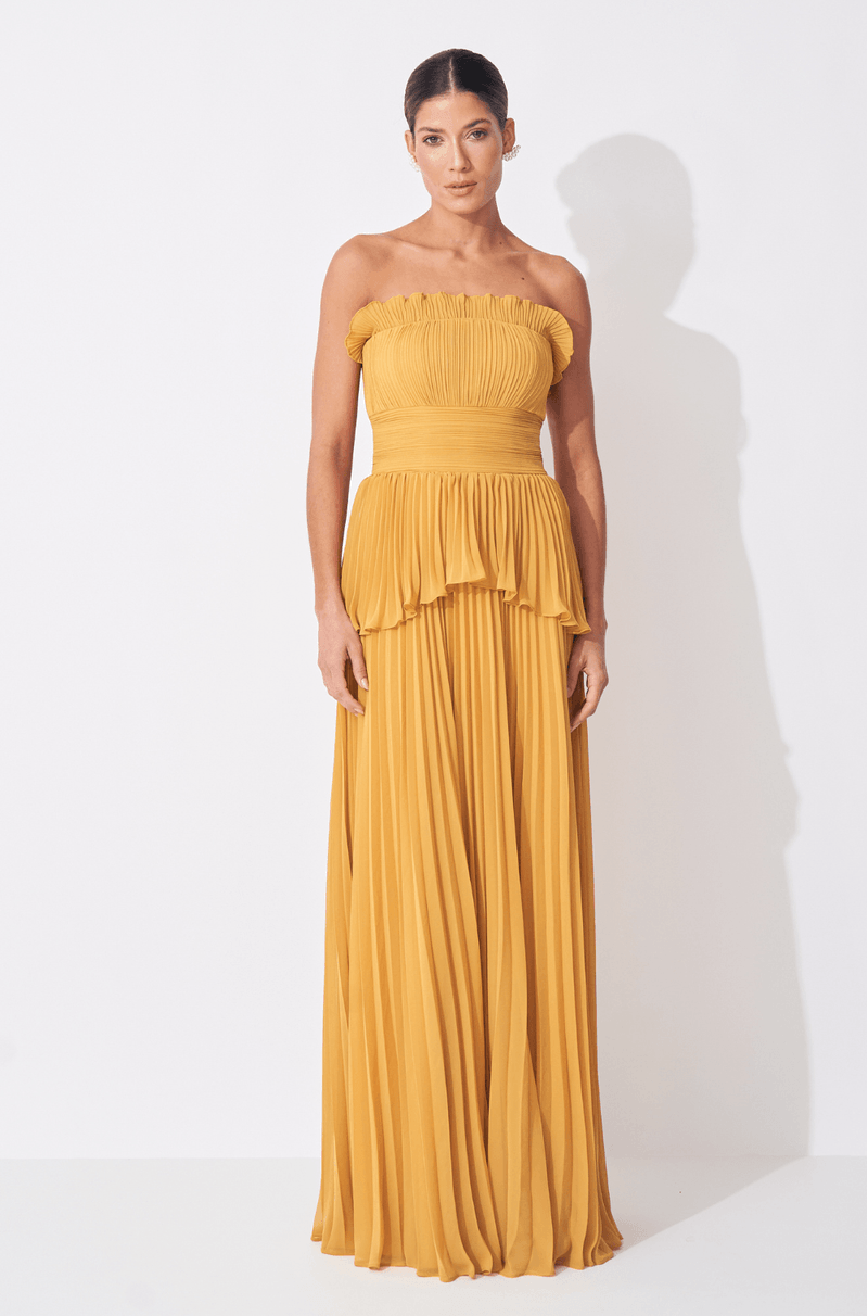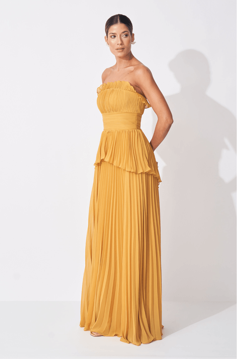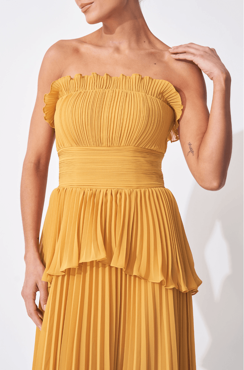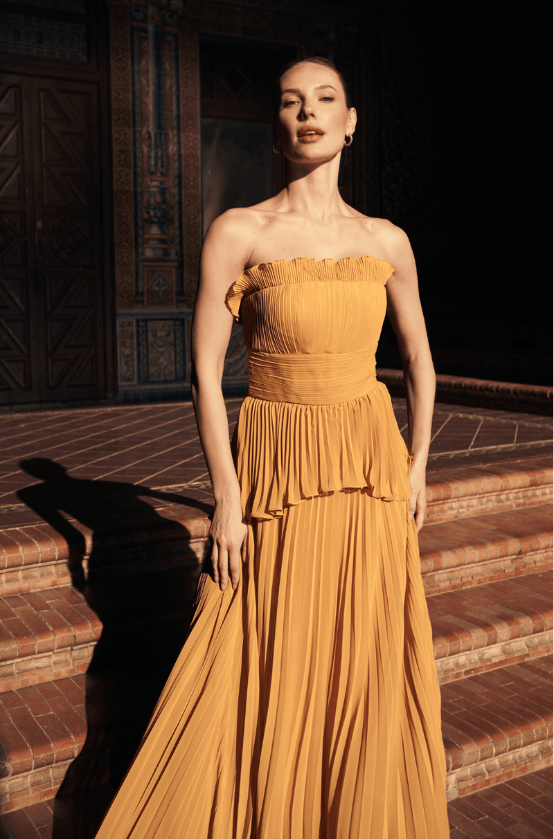 Encante-se com o vestido longo em chiffon plissado, uma peça que une elegância e fluidez, ideal para eventos que exigem sofisticação e estilo. O decote sem alças é delicadamente adornado com babado plissado, conferindo leveza e charme à região do busto.