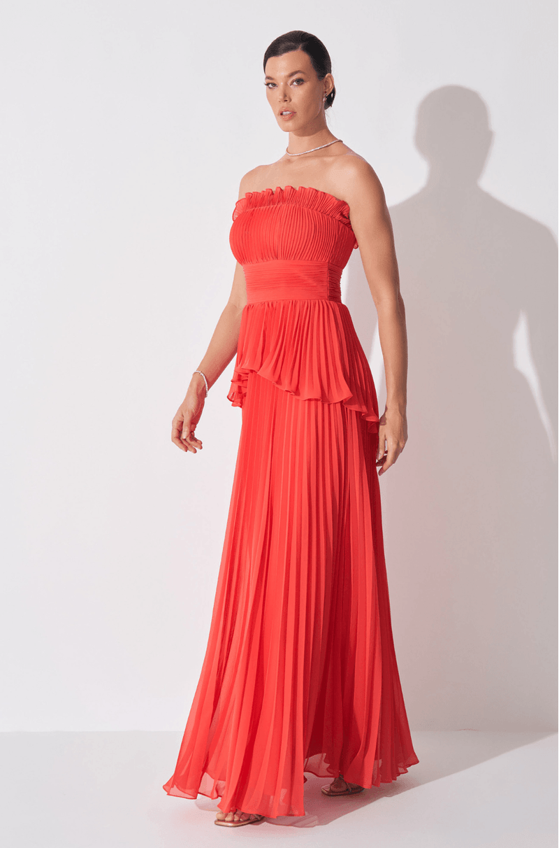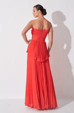 Encante-se com o vestido longo em chiffon plissado, uma peça que une elegância e fluidez, ideal para eventos que exigem sofisticação e estilo. O decote sem alças é delicadamente adornado com babado plissado, conferindo leveza e charme à região do busto.
