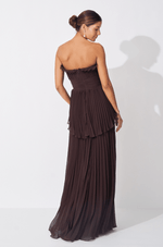 Encante-se com o vestido longo em chiffon plissado, uma peça que une elegância e fluidez, ideal para eventos que exigem sofisticação e estilo. O decote sem alças é delicadamente adornado com babado plissado, conferindo leveza e charme à região do busto.