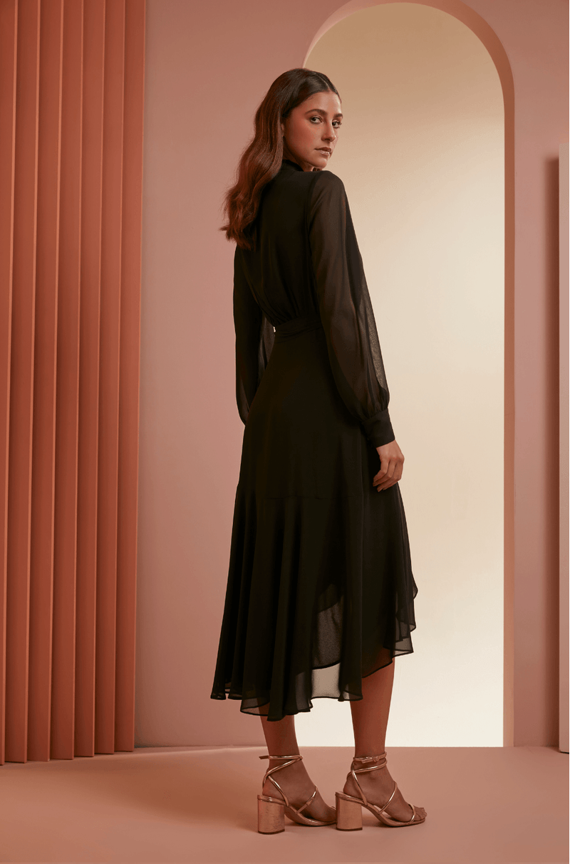 Vestido midi em chiffon que traz transparência e leveza. Decote V transpassado com pregas nos ombros e gola criando lindo caimento. As mangas longas bufantes com punho trazem um toque de transparência delicada. Saia midi com transpasse e babado assimétrico trazendo movimento fluido ao caminhar. É o modelo versátil para usar em compromissos diurnos ou noturnos, apenas mudando os acessórios.