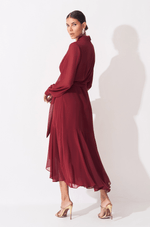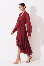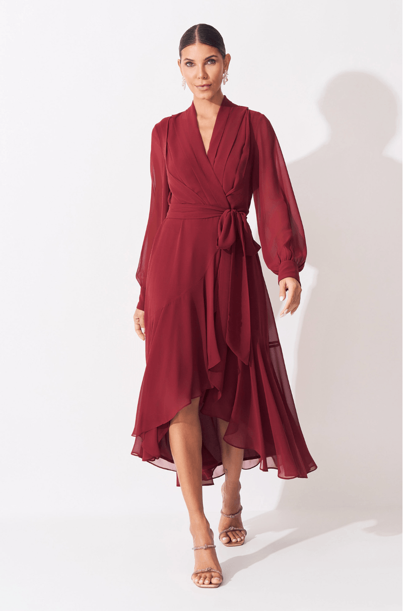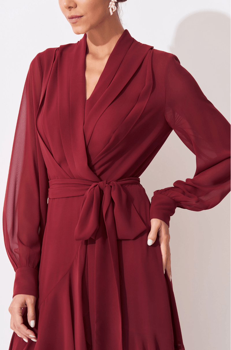 Vestido midi em chiffon que traz transparência e leveza. Decote V transpassado com pregas nos ombros e gola criando lindo caimento. As mangas longas bufantes com punho trazem um toque de transparência delicada. Saia midi com transpasse e babado assimétrico trazendo movimento fluido ao caminhar. É o modelo versátil para usar em compromissos diurnos ou noturnos, apenas mudando os acessórios.