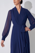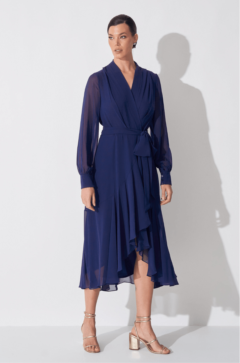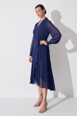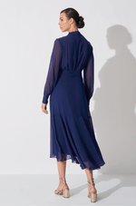 Vestido midi em chiffon que traz transparência e leveza. Decote V transpassado com pregas nos ombros e gola criando lindo caimento. As mangas longas bufantes com punho trazem um toque de transparência delicada. Saia midi com transpasse e babado assimétrico trazendo movimento fluido ao caminhar. É o modelo versátil para usar em compromissos diurnos ou noturnos, apenas mudando os acessórios. Detalhes da peça: - Decote V com transpasse - Pregas nos ombros e gola - Mangas longas bufantes com punho - Saia transpassada - Babados assimétricos na saia #DicaAmiga: Para um look diurno aposte em sapatilhas ou sandálias delicadas e rabo de cavalo alto para criar um visual feminino e prático. Já para noite, pode apostar em um batom marcante, salto alto e acessórios brilhantes.