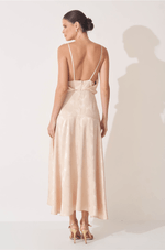 Descubra a elegância atemporal do nosso vestido midi confeccionado em viscose acetinada de toque suave, que proporciona um caimento leve e um brilho sutil, ideal para ocasiões que exigem sofisticação. O decote degagê realça o colo com delicadeza, enquanto a cintura blusê, combinada às alças finas, confere leveza e conforto ao visual. O recorte liso na região do quadril alonga a silhueta, culminando em uma saia evasê que se movimenta com graça e fluidez.