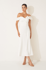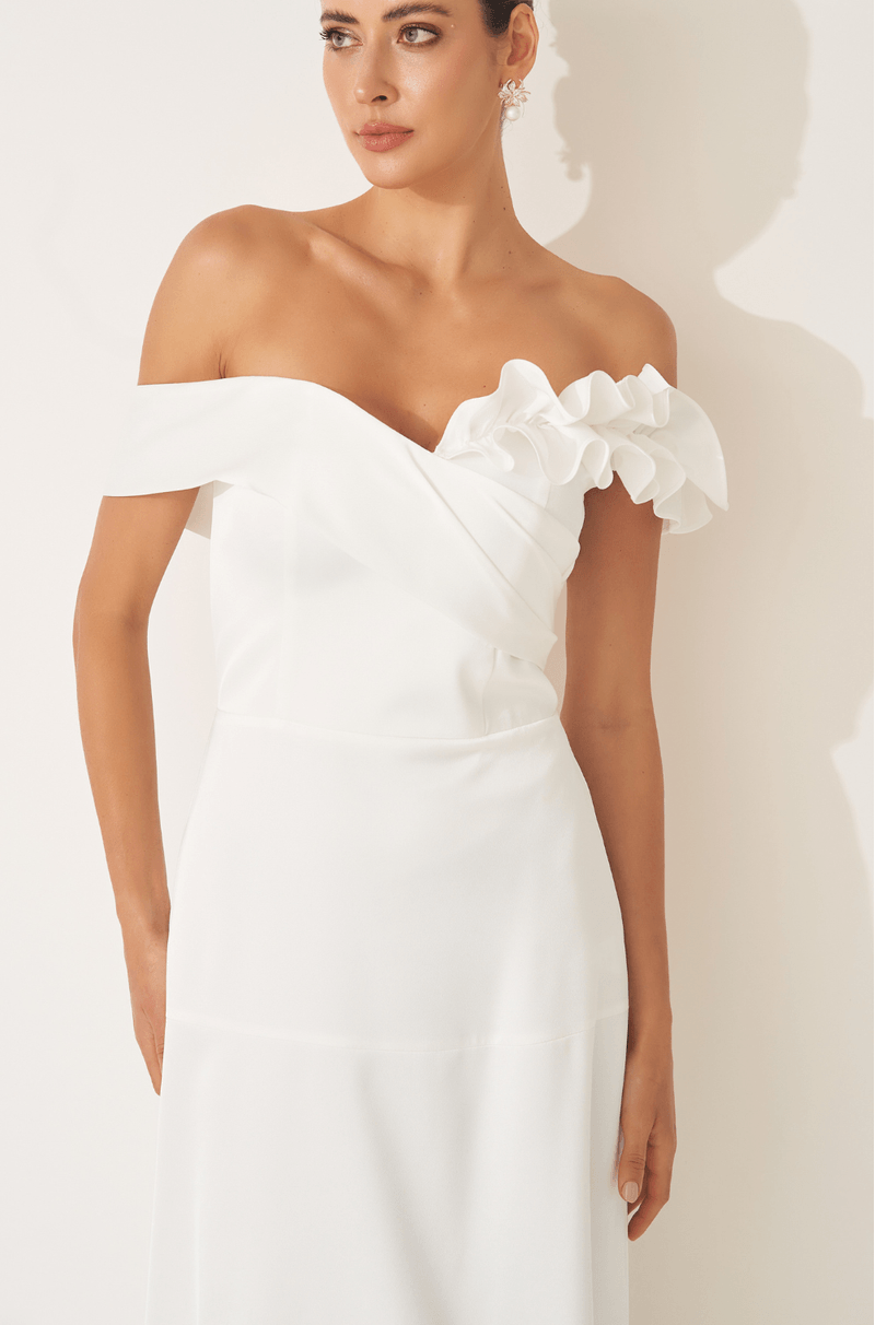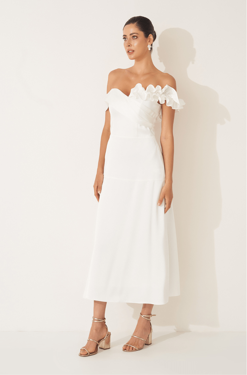 Com design autoral e acabamento refinado, este vestido midi em crepe acetinado é a definição de elegância moderna. A modelagem única e os detalhes assimétricos conferem personalidade à peça, ideal para mulheres que desejam um visual sofisticado, com estilo e originalidade. O destaque fica por conta do decote ombro a ombro, que valoriza a região do colo com feminilidade, criando um equilíbrio perfeito entre sensualidade e elegância. O charme da peça está nas mangas assimétricas: de um lado, um babado delicado, e do outro, uma manga com pregas partindo da cintura, criando um movimento arquitetônico e sutil. O recorte tipo pala no quadril contorna e valoriza a silhueta, enquanto a saia evasê oferece leveza e fluidez ao caminhar. O fechamento em zíper invisível nas costas finaliza com sofisticação e discrição. Detalhes da peça: - Tecido fluido e elegante em crepe acetinado - Decote ombro a ombro, que valoriza o colo - Manga assimétrica: babado delicado de um lado e manga com pregas do outro - Recorte tipo pala no quadril, que define a silhueta - Saia evasê midi, com caimento leve e sofisticado - Zíper invisível central nas costas, para acabamento limpo #DicaDeEstilo: Aposte em sandálias de tiras finas, clutch estruturada e um coque baixo elegante para destacar os ombros e os detalhes assimétricos do vestido. Um par de brincos discretos com brilho e uma maquiagem iluminada completam o look com perfeição.