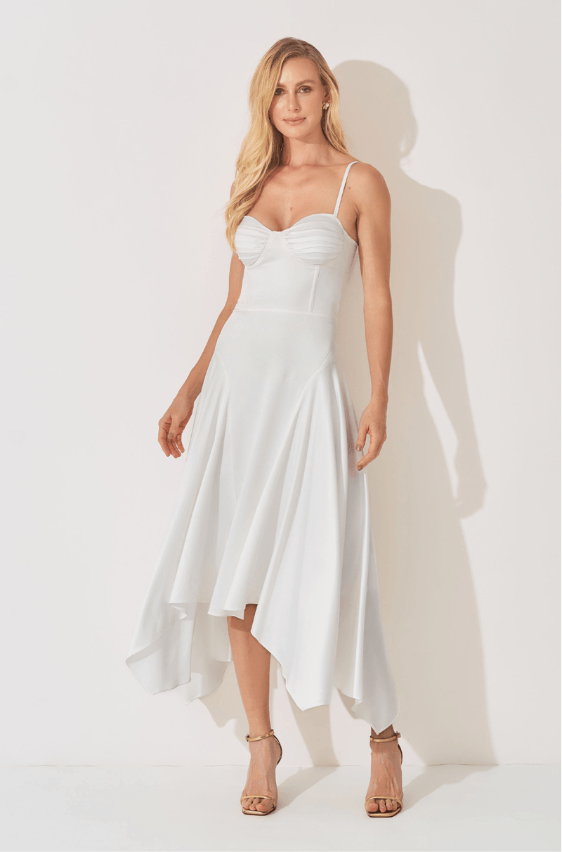 A cintura estruturada com barbatanas modela o corpo com precisão, destacando a silhueta de maneira natural. Já a saia godê com recorte franzido lateral confere leveza e movimento, criando um efeito fluido a cada passo.