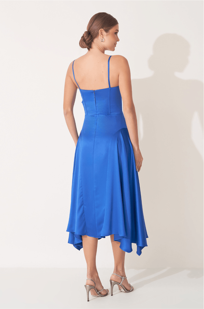 A cintura estruturada com barbatanas modela o corpo com precisão, destacando a silhueta de maneira natural. Já a saia godê com recorte franzido lateral confere leveza e movimento, criando um efeito fluido a cada passo.