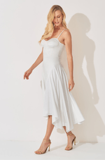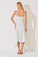 A cintura estruturada com barbatanas modela o corpo com precisão, destacando a silhueta de maneira natural. Já a saia godê com recorte franzido lateral confere leveza e movimento, criando um efeito fluido a cada passo.