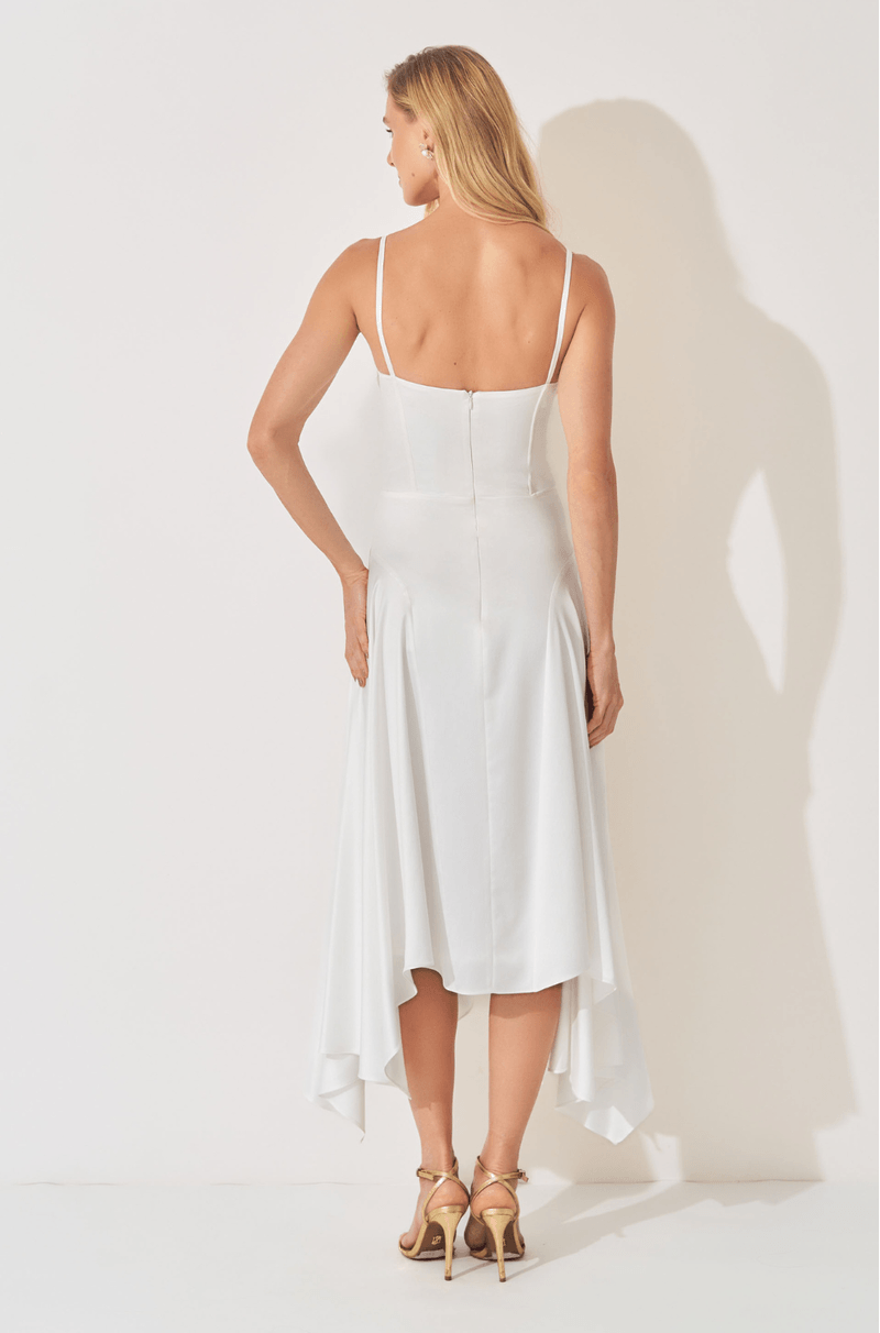Delicado e sofisticado, o vestido midi em crepe acetinado combina brilho sutil, caimento estruturado e toque acetinado para um visual que traduz feminilidade com elegância. O decote meia-taça com busto franzido e alças finas valoriza o colo de forma graciosa, enquanto o fechamento em zíper invisível nas costas garante acabamento limpo e moderno.