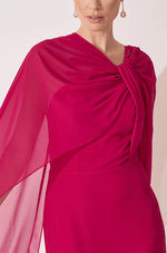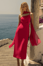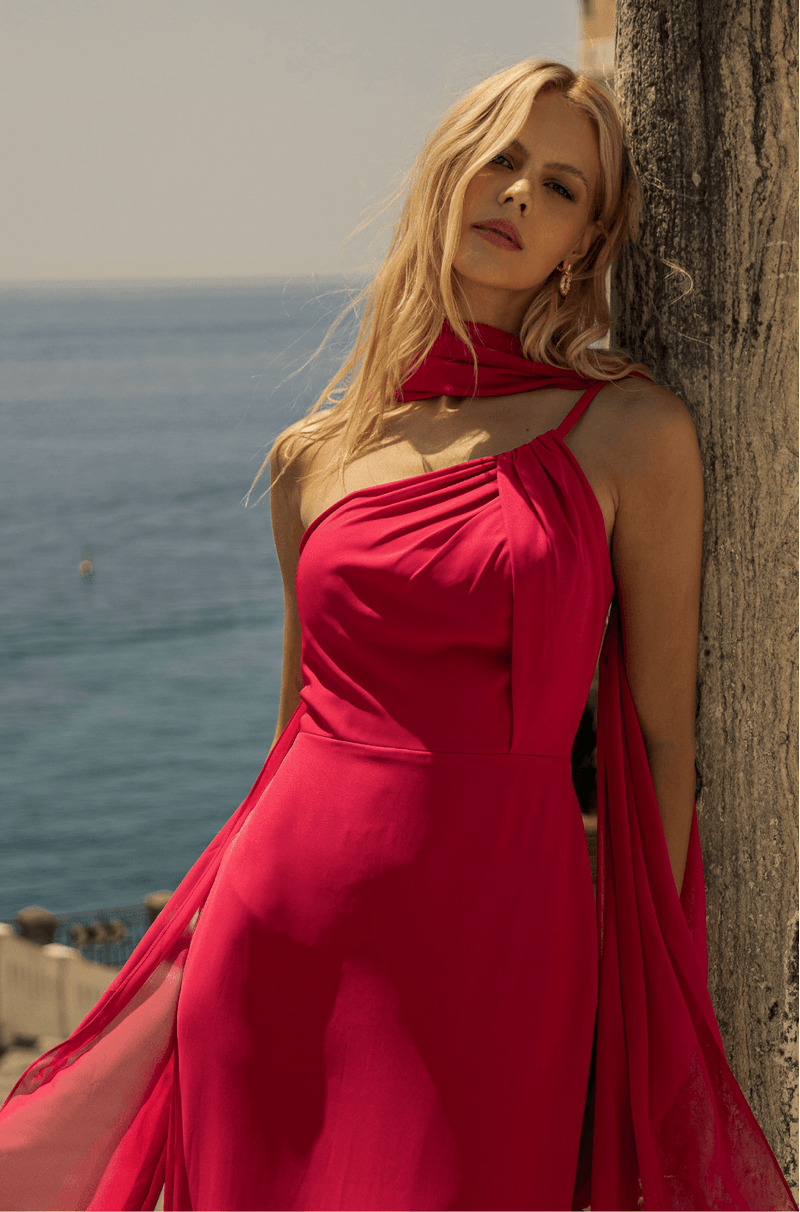 O design de ombro único conta com alça fina e detalhe de passante no busto, pensado para acomodar o lenço removível em chiffon ¿ um diferencial que permite compor diferentes estilos em um único look. A saia reta com fenda traseira garante movimento, conforto e um visual refinado.