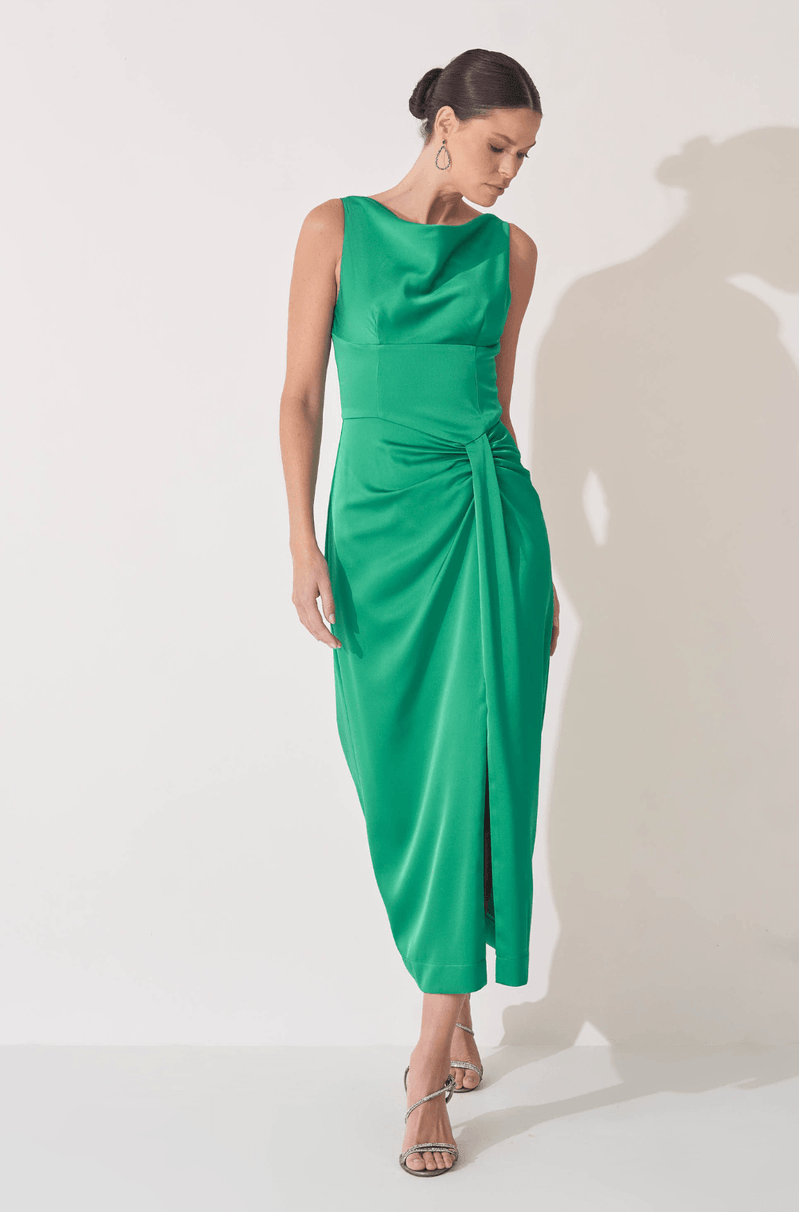 O decote canoa com leve degagê no busto realça o colo com delicadeza, conferindo um toque de requinte. O recorte vertical na cintura esculpe a silhueta com precisão, enquanto a saia reta se destaca pela prega lateral que se abre em uma fenda, adicionando mobilidade e charme.