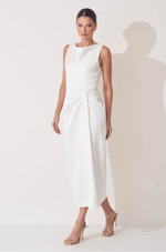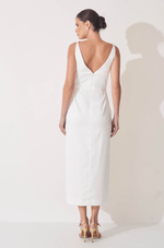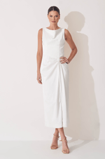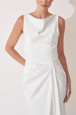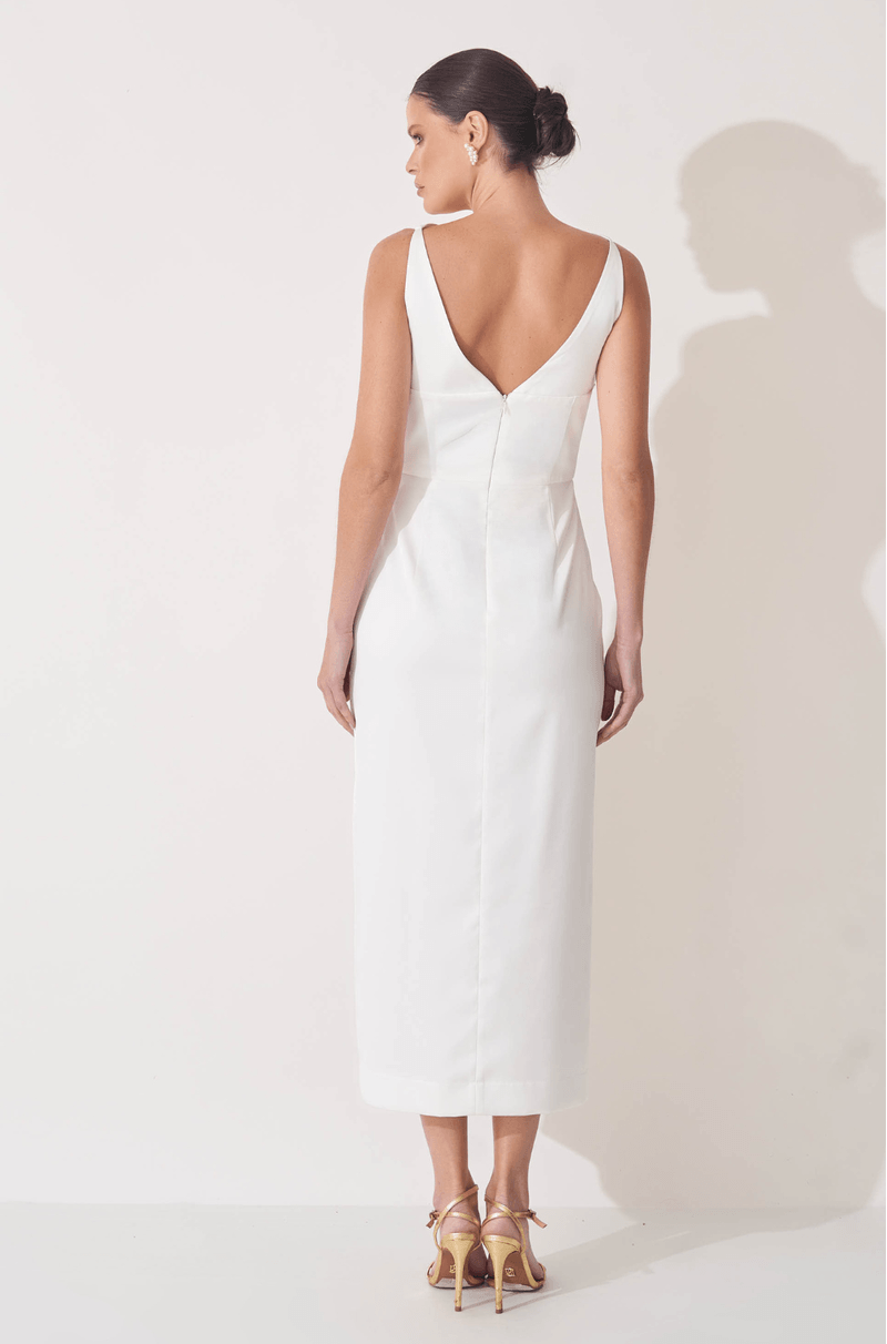 Este vestido midi alongado em crepe estruturado combina elegância moderna e design minimalista, perfeito para mulheres que valorizam sofisticação e estilo contemporâneo.