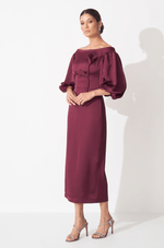 A silhueta lápis valoriza as curvas com delicadeza, enquanto o decote canoa equilibra as proporções do corpo. As mangas bufantes 7/8 adicionam um toque moderno e elegante ao look.