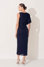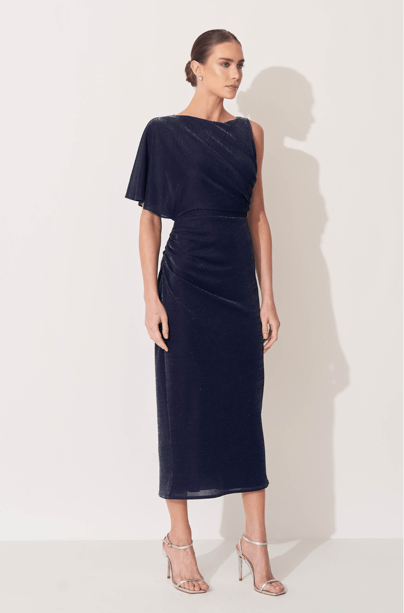 O decote canoa com mangas assimétricas cria um visual surpreendente e contemporâneo, enquanto o franzido lateral no quadril valoriza a silhueta de forma sutil e feminina. A modelagem lápis equilibra o look com uma proposta ajustada, ideal para ocasiões que pedem presença e estilo.