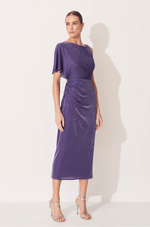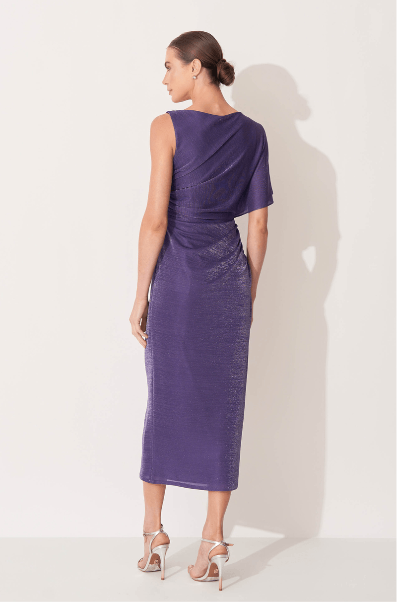 O decote canoa com mangas assimétricas cria um visual surpreendente e contemporâneo, enquanto o franzido lateral no quadril valoriza a silhueta de forma sutil e feminina. A modelagem lápis equilibra o look com uma proposta ajustada, ideal para ocasiões que pedem presença e estilo.