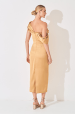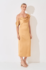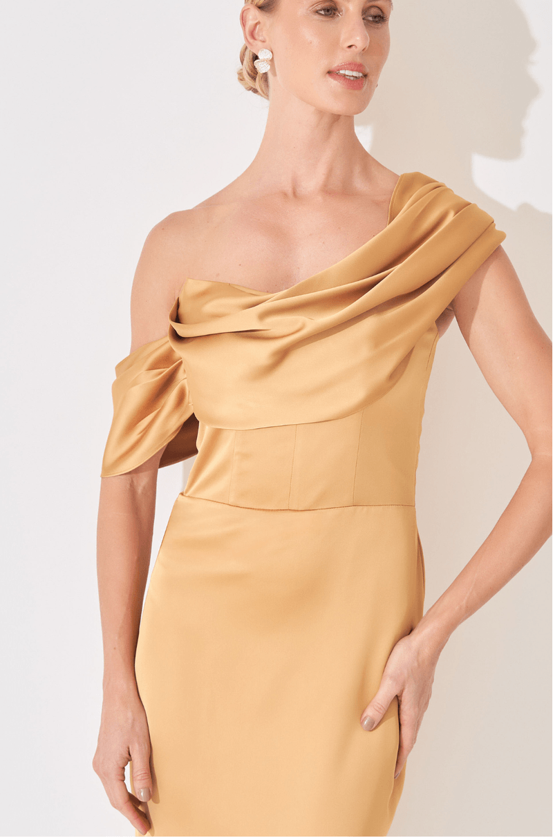 O vestido midi em tecido acetinado traduz elegância e modernidade em uma única peça. Com brilho sutil e caimento impecável, valoriza as curvas com delicadeza e sofisticação. O decote assimétrico estruturado, com pregas drapeadas no busto, cria um efeito pontudo elegante e contemporâneo, enquanto a manga caída sobre o ombro adiciona um toque de charme e distinção.