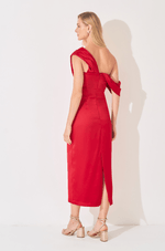 O vestido midi em tecido acetinado traduz elegância e modernidade em uma única peça. Com brilho sutil e caimento impecável, valoriza as curvas com delicadeza e sofisticação. O decote assimétrico estruturado, com pregas drapeadas no busto, cria um efeito pontudo elegante e contemporâneo, enquanto a manga caída sobre o ombro adiciona um toque de charme e distinção.