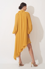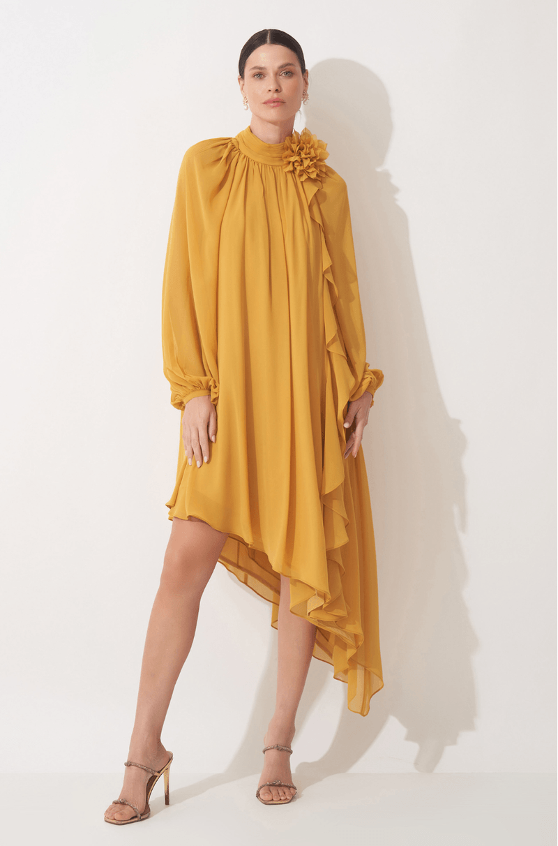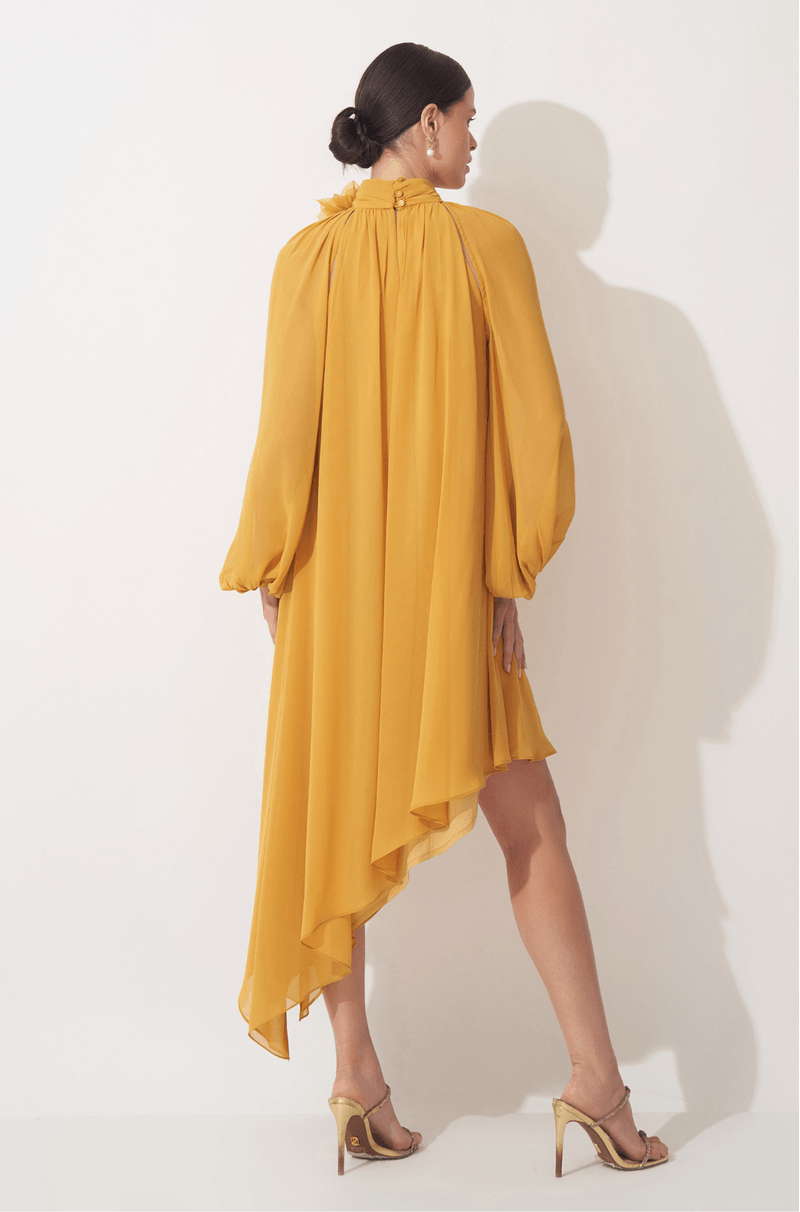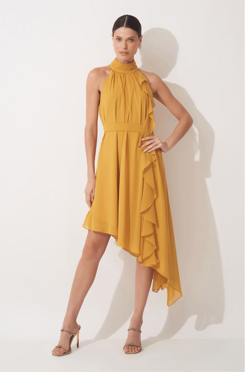 Com design leve e movimento marcante, este vestido traduz sofisticação com um toque fashion e feminino. A proposta de decote frente única com gola alta levemente franzida cria um visual elegante e alonga a silhueta, enquanto o botão personalizado nas costas adiciona um acabamento exclusivo e refinado.