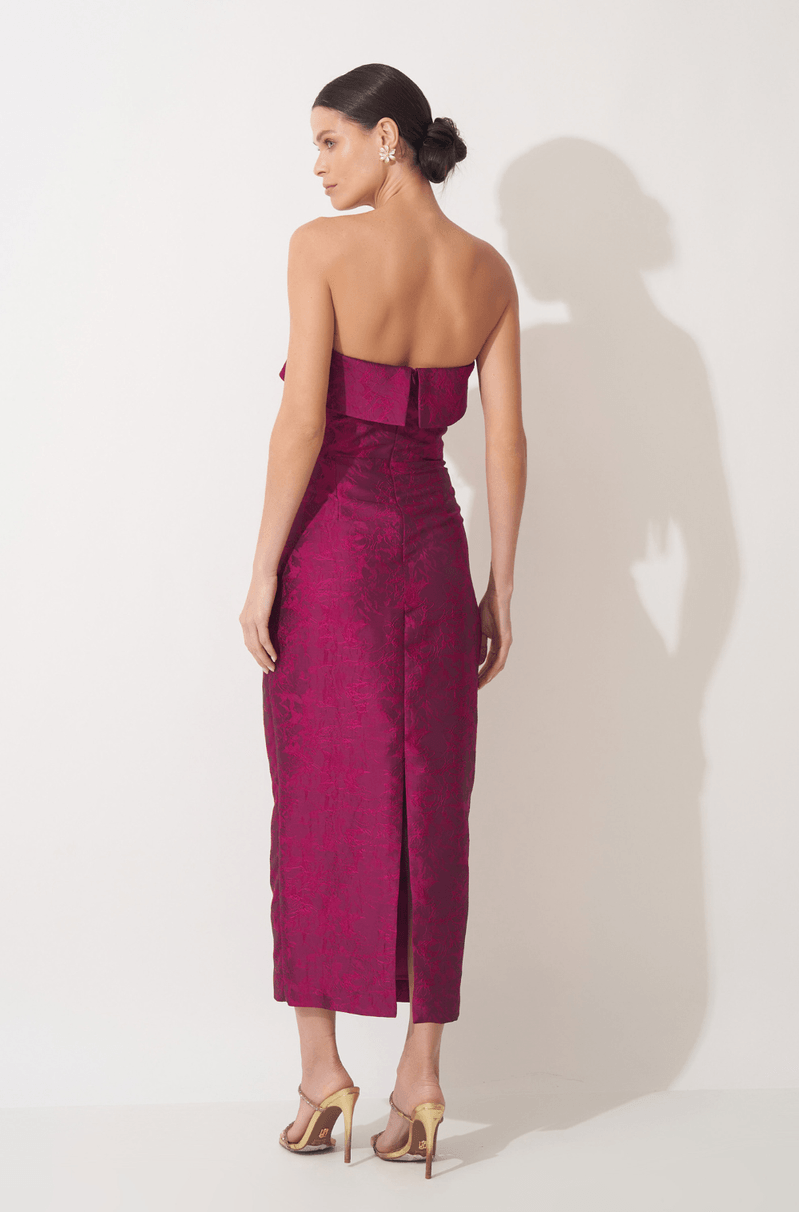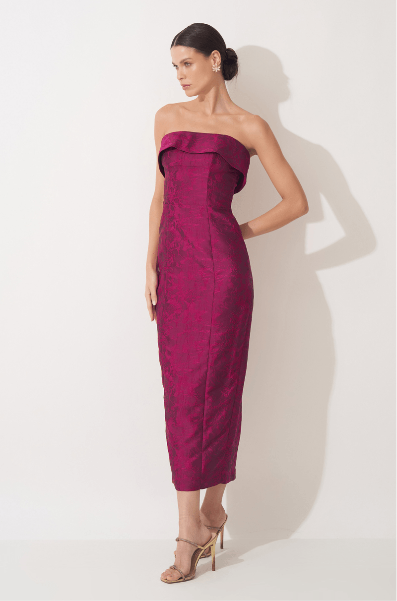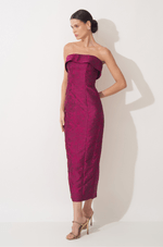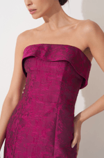 Este midi alongado em jacquard texturizado une elegância e um brilho sutil, destacando a peça com discrição e impacto na medida certa. O decote sem alças apresenta uma pala estruturada que cria um efeito arquitetônico, moldando o colo com precisão e delicadeza, ao mesmo tempo em que adiciona um toque contemporâneo ao visual.