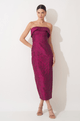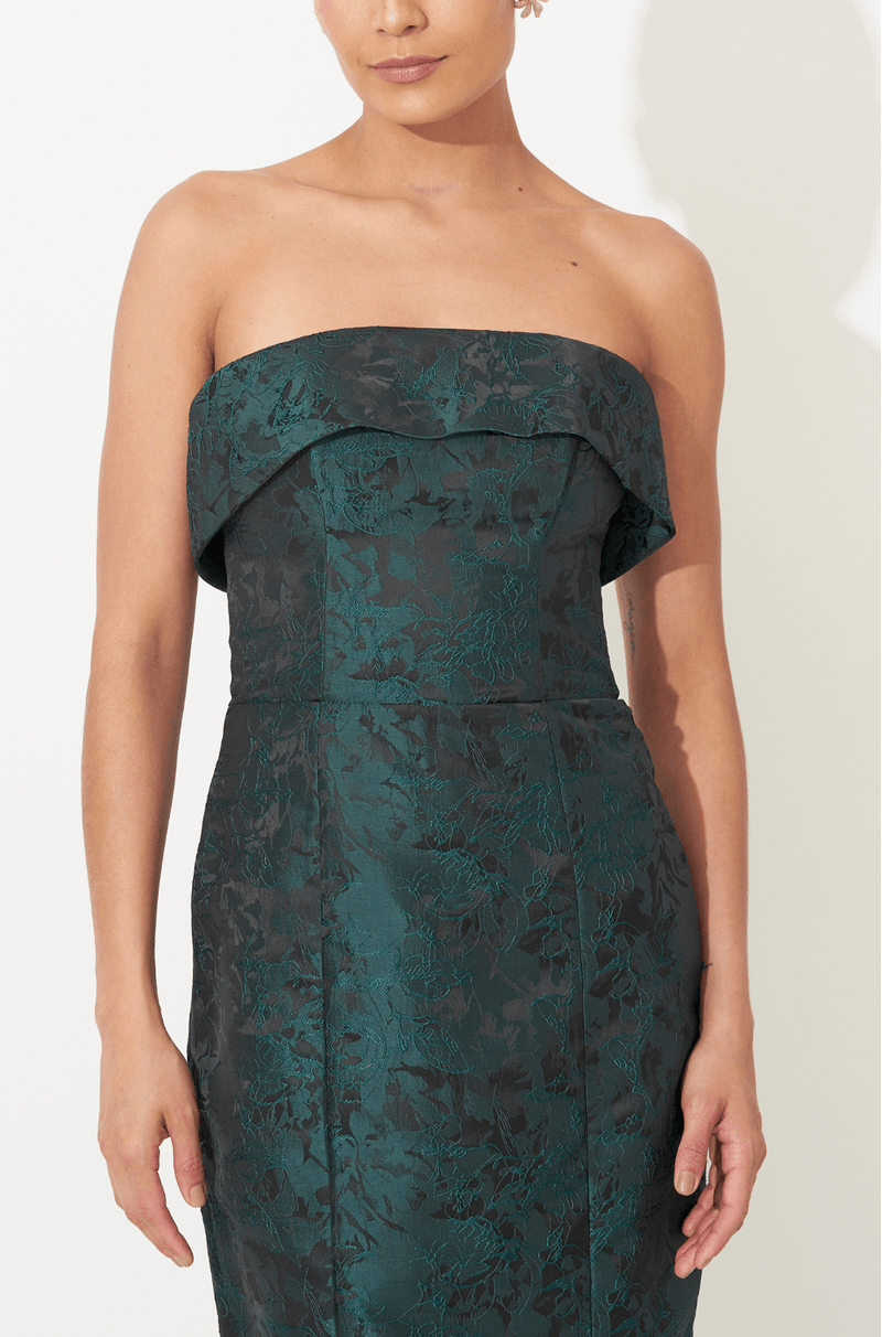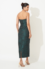 Este midi alongado em jacquard texturizado une elegância e um brilho sutil, destacando a peça com discrição e impacto na medida certa. O decote sem alças apresenta uma pala estruturada que cria um efeito arquitetônico, moldando o colo com precisão e delicadeza, ao mesmo tempo em que adiciona um toque contemporâneo ao visual.
