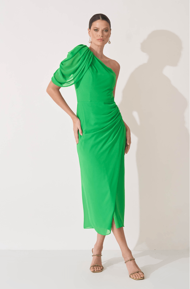 Este vestido midi em chiffon destaca-se pelo caimento leve e toque romântico, ideal para quem busca elegância com conforto. O decote ombro único, combinado com a manga curta franzida, traz assimetria e charme à parte superior do modelo.