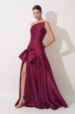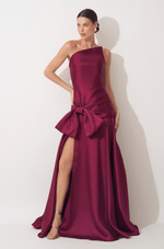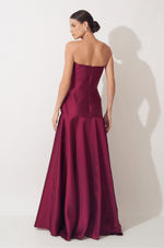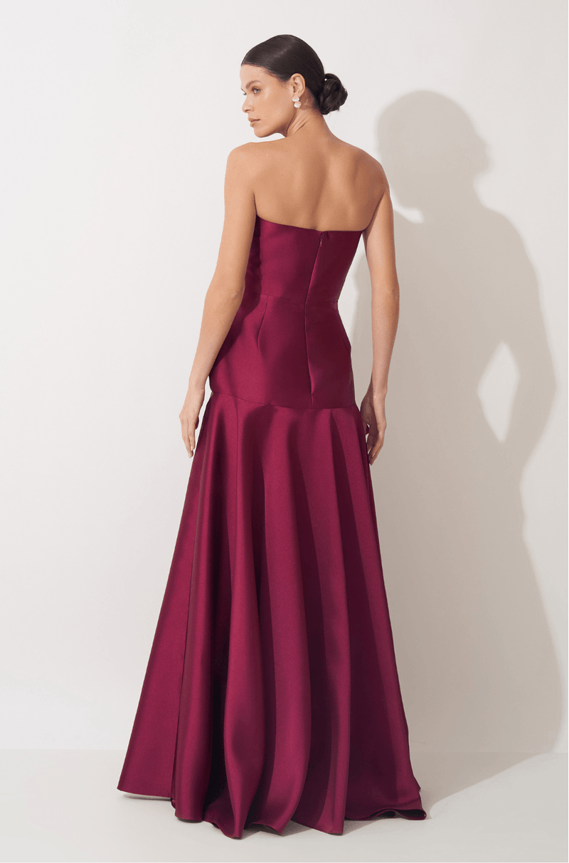 Longo em zibeline, tecido encorpado que garante presença e um visual impecável. O vestido combina estrutura e feminilidade em cada detalhe: o decote sem alças, com busto assimétrico levemente pontudo, valoriza o colo com um toque de modernidade, enquanto o caimento ajustado no quadril desenha a silhueta com sofisticação. Na lateral, o laço estruturado adiciona charme e um ar de refinamento absoluto.