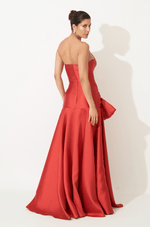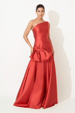 Longo em zibeline, tecido encorpado que garante presença e um visual impecável. O vestido combina estrutura e feminilidade em cada detalhe: o decote sem alças, com busto assimétrico levemente pontudo, valoriza o colo com um toque de modernidade, enquanto o caimento ajustado no quadril desenha a silhueta com sofisticação. Na lateral, o laço estruturado adiciona charme e um ar de refinamento absoluto.