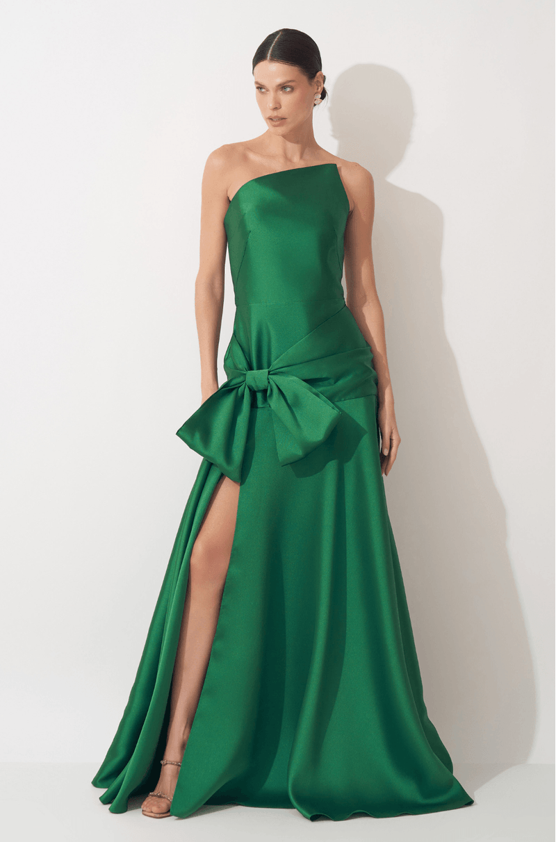 Longo em zibeline, tecido encorpado que garante presença e um visual impecável. O vestido combina estrutura e feminilidade em cada detalhe: o decote sem alças, com busto assimétrico levemente pontudo, valoriza o colo com um toque de modernidade, enquanto o caimento ajustado no quadril desenha a silhueta com sofisticação. Na lateral, o laço estruturado adiciona charme e um ar de refinamento absoluto.